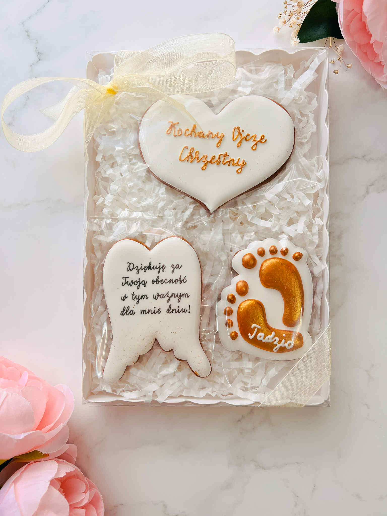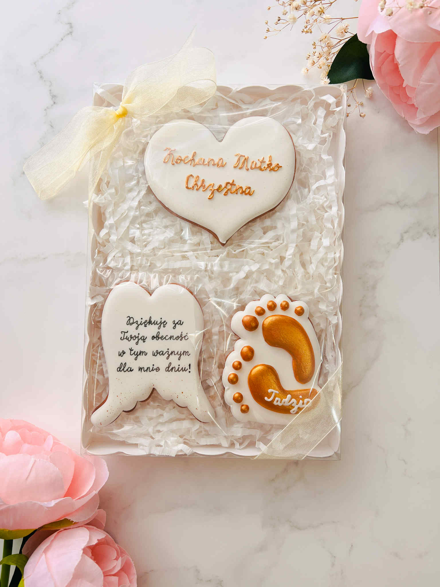 Elegancki zestaw pierników jako wyjątkowe podziękowanie dla chrzestnych.